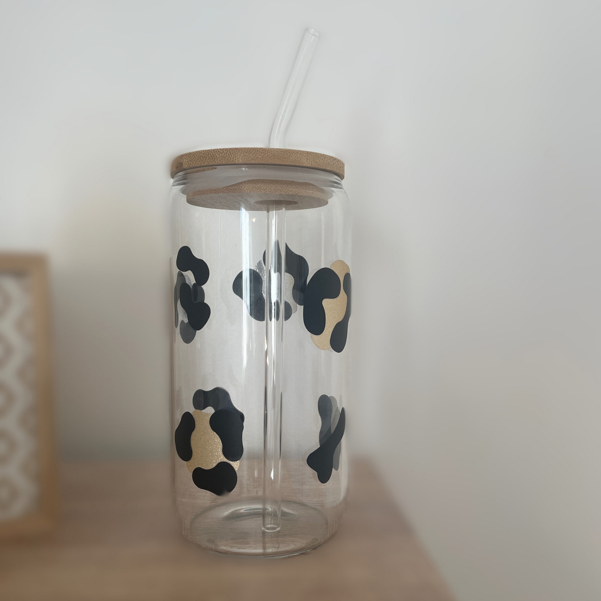 Verre Cannette en Verre Transparent avec Vinyle – Léopard Doré et Noir (500 ml)