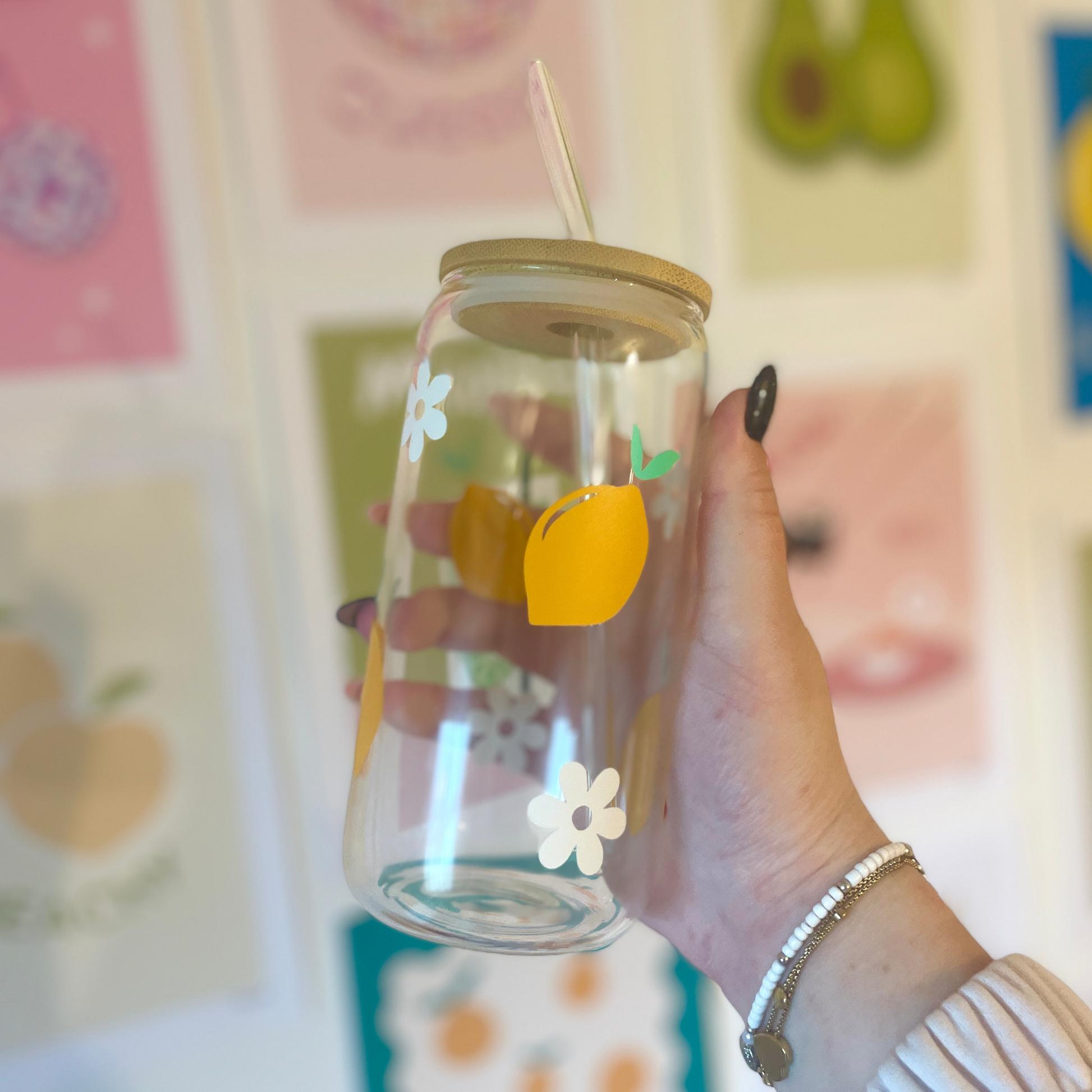 Verre Cannette en Verre Transparent avec Vinyle – Citron et Fleurs (500 ml)